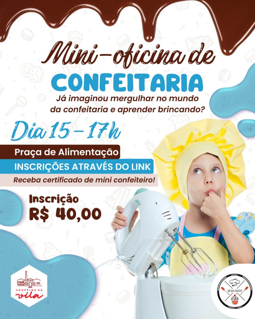 Essa incrível parceria entre a Zé do Doce e o Shopping da Vila promete encantar a todos com a magia da confeitaria. Não perca tempo! Acesse agora mesmo shoppingdavila.com.br e faça a inscrição para juntar-se a essa aventura culinária. Prepare-se para testemunhar a alegria no rosto do seu filho enquanto ele aprende a confeitar!