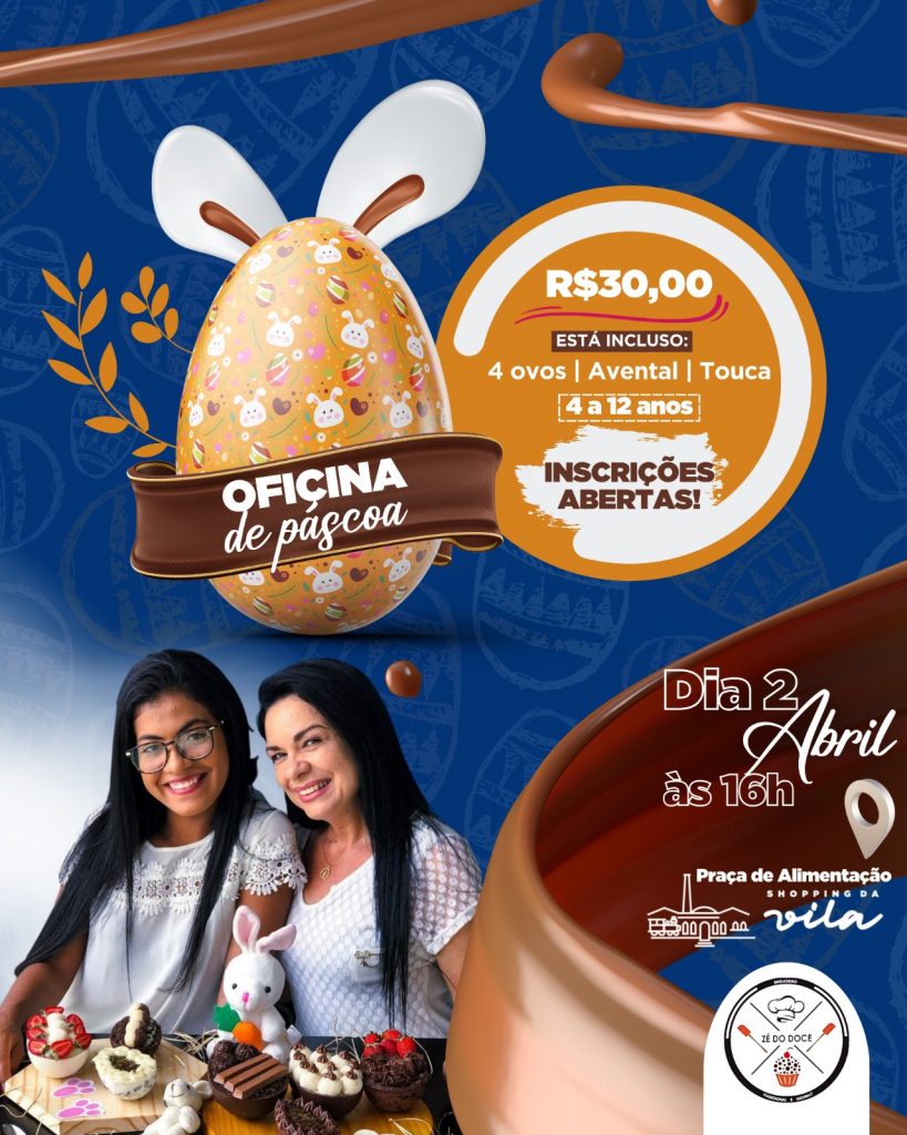 A Páscoa do Shopping da Vila, já está chegando! E pensando nisso, o Shopping da Vila, em parceria com a doceria Zé do Doce, realiza no próximo domingo dia 02 de abril, a partir das 16h00, uma Oficina de Pascoa Infantil.